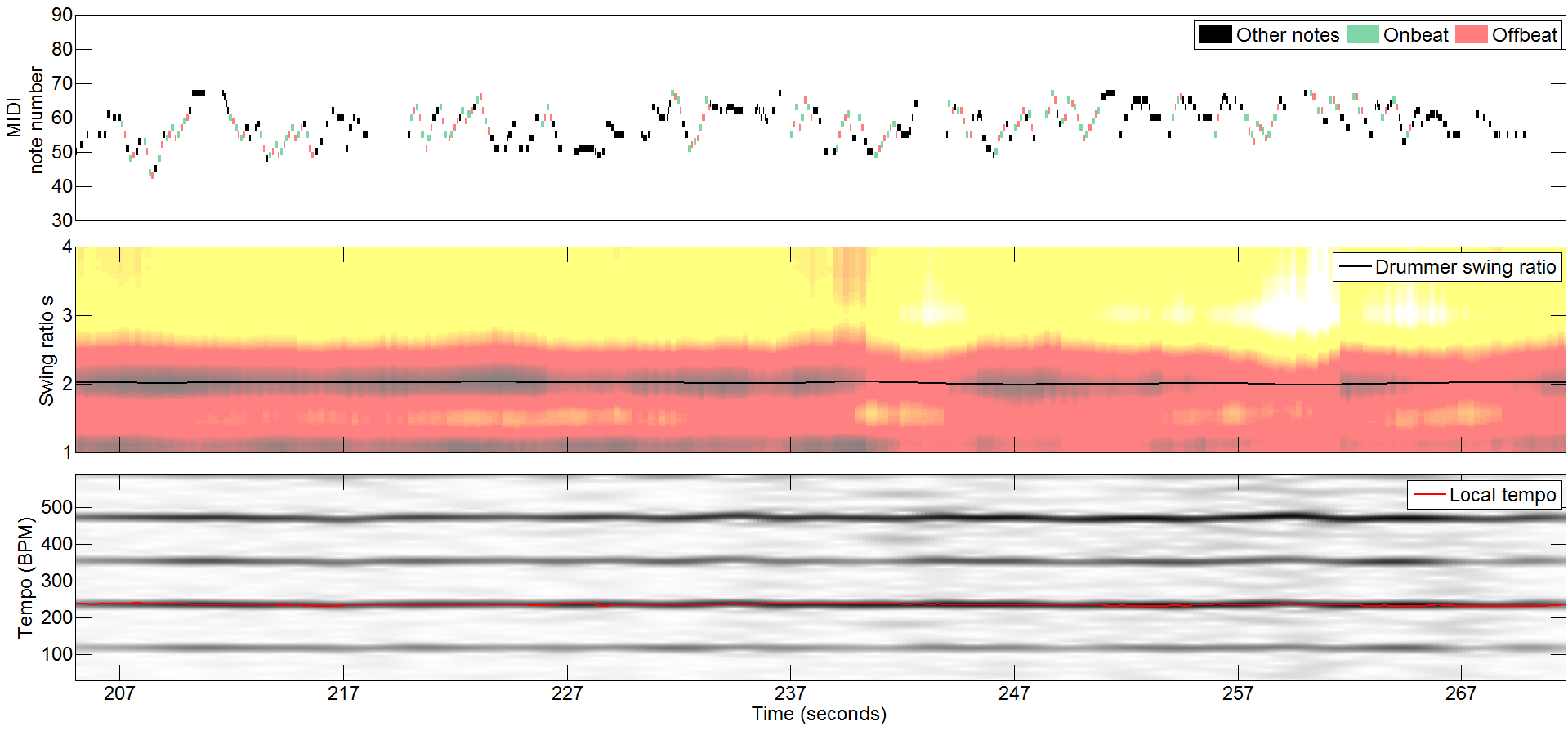 In the figures above, we show the piano-roll, swingogram, and tempogram of a solo section from the 1960 recording of "The Red Door". This excerpt features solo baritone sax player Gerry Mulligan and drummer Mel Lewis. It is remarkable that Lewis keeps the idealized tied triplet swing ratio for more than 60 seconds at an average tempo around 236 BPM. Mulligan plays in the same clockwork-like fashion, almost always synchronizing his onbeat onsets to those of Lewis. However, he shows quite some variability in his offbeat onsets, showing higher swing ratio at phrase endings, as hypothesized by Benadon [4].